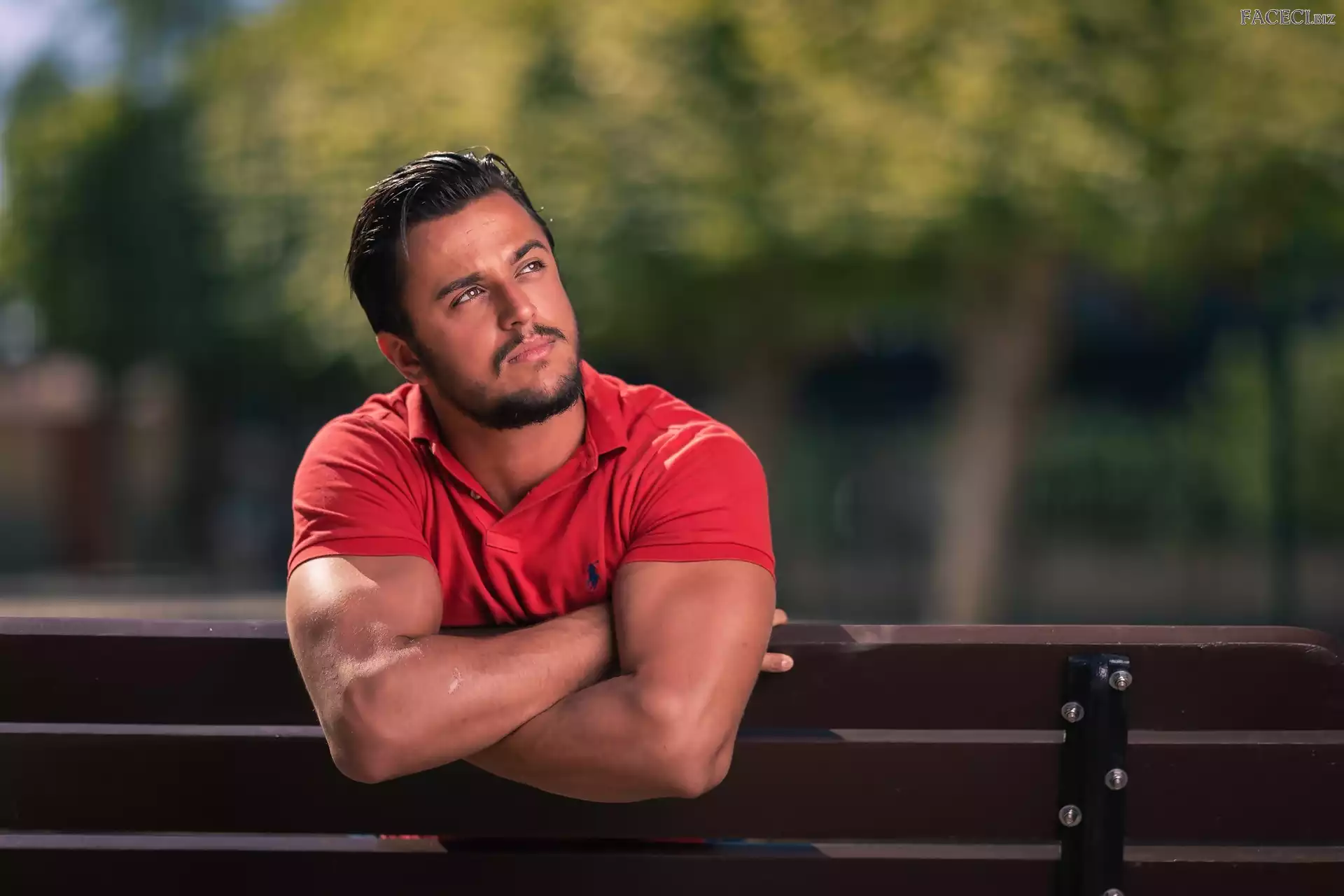 Ławka, Koszulka, Broda, Mężczyzna, Czerwona - faceci.biz